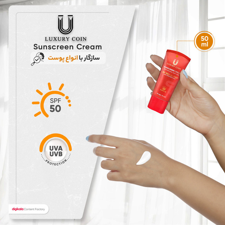 کرم ضدآفتاب بدون رنگ لاکچری کوین، مدل SPF50، ‌مناسب انواع پوست، حجم 50 میلی‌لیتر، ضد آب، محافظت کننده در برابر اشعه UVA ،UVB، ضد پیری پوست، فاقد چربی، مرطوب کننده، تقویت‌کننده ساختار پوست، با ماندگاری 2 ساعته